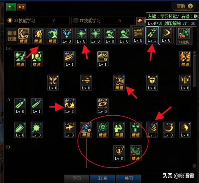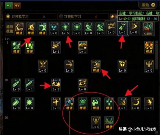 受身蹲伏一级;物理暴击根据自己本身暴击几率,只要进图满暴击就行;封印解除一级吃宝珠即可;红阵点满增加力量;崩山击一级即可(点两级是因为我自己正好剩下15sp);三段斩一级赶路;红圈之中各种被动技能全部点满——