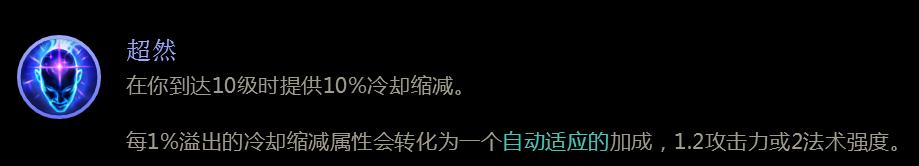 其详细介绍为:在到达10级时获得10%的冷却缩减,每1%溢出的冷却缩减将为你提供1.2攻击力或2法术强度的自适应加成。