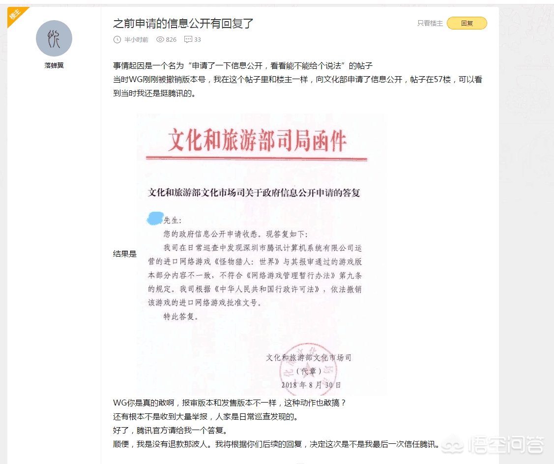 就在大家都快忘了这件事的时候,事情发生了转机,在Wegame《怪物猎人:世界》的游戏圈内,貌似某知情人发布了一个关于这款游戏下架原因的帖子: