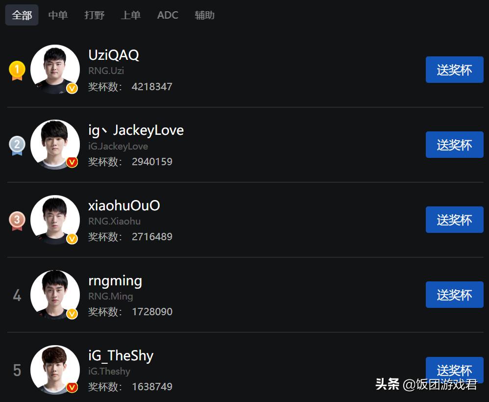 要说今年LPL哪两位选手进入全明星,大概率还是RNG选手,从目前选手奖杯数来看(该奖杯数仅代表选手人气而非全明星投票),两位人气最高的选手是Uzi和JKL,然而Uzi和JKL是同一位置选手,由于Uzi票数高于JKL,JKL或因此无缘全明星。人气排在三四五位的选手分别为,RNG.xiaohu,RNG.Ming和Ig.The shy,这三位可以说也都是明星级选手,除了Uzi入选全明星之外,还有一位很可能从这三位中产生。