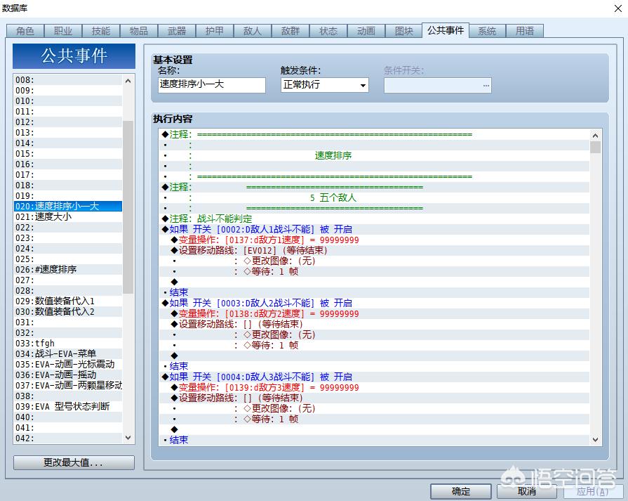 不管你是不是理科生,一定要有基本的编程基础,虽然rpgmaker都是现成的嵌套循环,但是有了编程的逻辑性,你可以优化你的事件进程。至少能够写的不会太乱。(下面是我写的速度排序事件,原来写的超级多,后来上大学学了一个算法,立刻从200行缩减到十几行……)