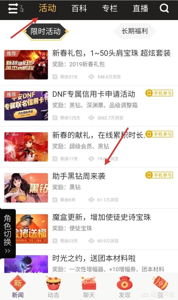 然后点击上方的"活动"栏,限时活动中可以看到有一个叫做"助手黑钻周来袭"的活动。其实之前也出过类似的活动,然后还有一些在线游戏时长可以领的一些小道具,像药水啊,疲劳药之类的,给小号用还是很不错的。