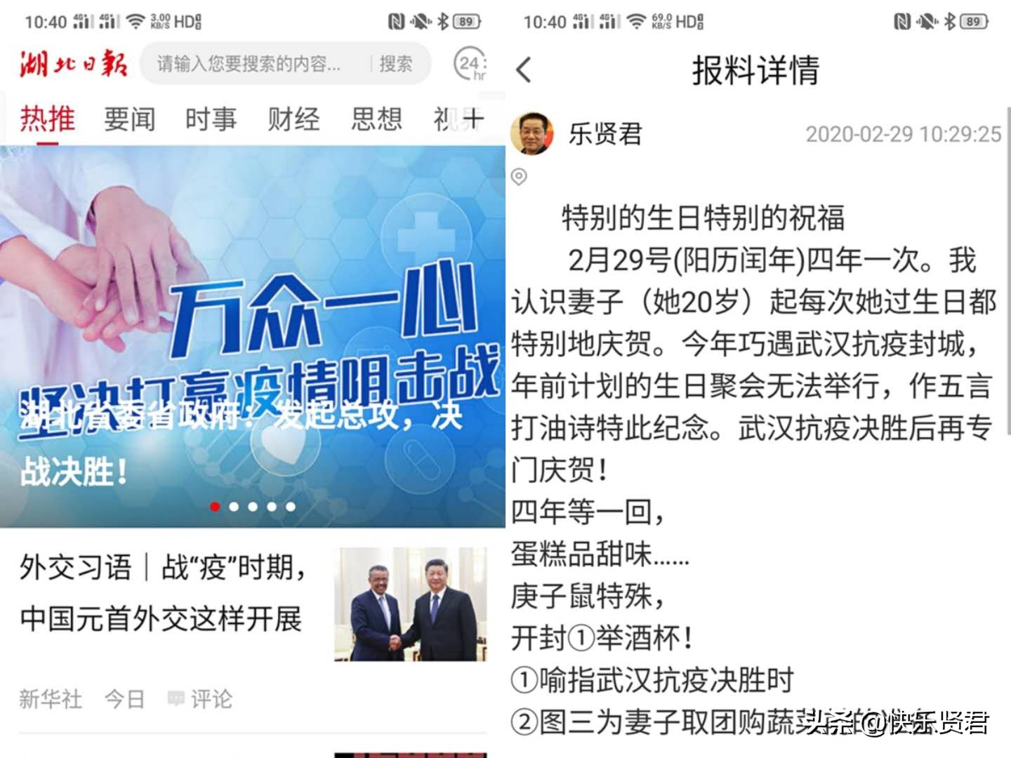 二、特别生日特别祝福。2月29日四年一次。这个特别的生日因为新冠疫情的袭扰妻子只能悄然度过。不甘中我编写打油诗成功作了新闻报料。妻子转发朋友圈后,引其闺蜜赞叹:你过生日上了湖北日报。