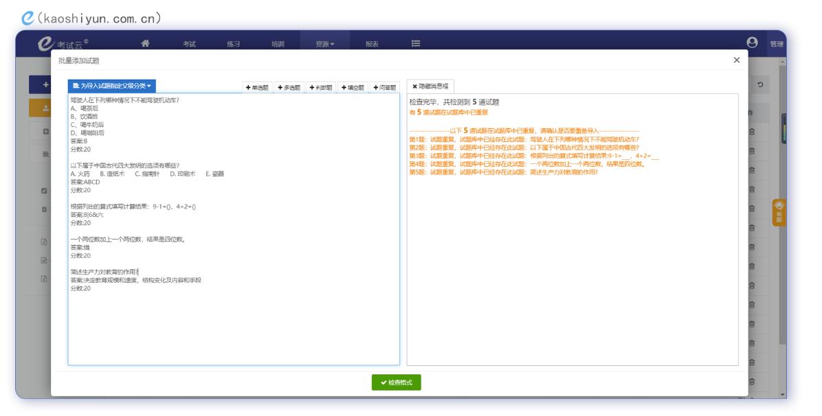 - 可视化批量新增:按照规定的试题格式,直接批量导入试题。编辑好试题后,可以一键检查系统的格式,如果试题格式有问题,可以及时进行调整。