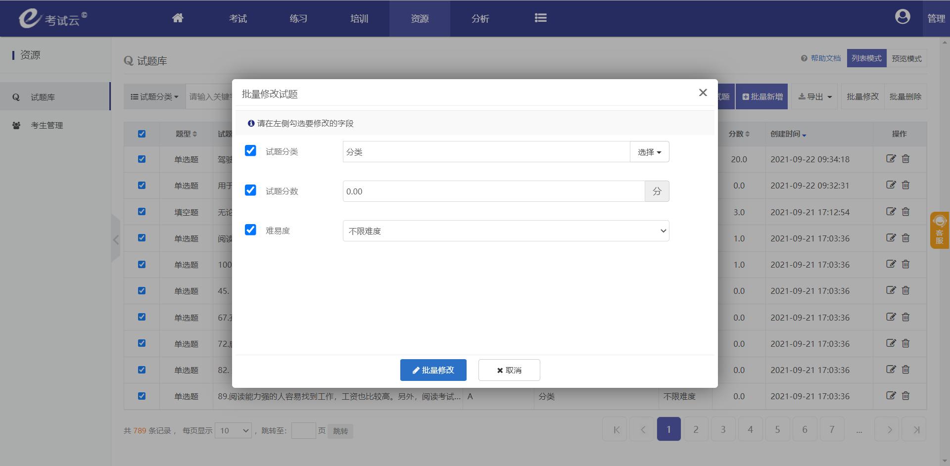 3,支持试题批量修改的操作