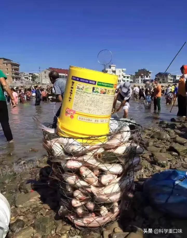 前一阵,该地降雨比较多,大量的溪水,河水从周边汇入海中,其中当然有大量的鱼类。