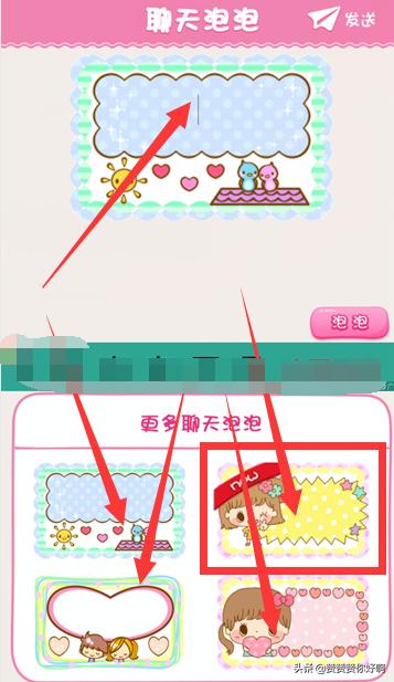 3、点击选择一款你喜欢的气泡,点击气泡中间,即可输入聊天文字(比如输入“手机乐园”),点击气泡右边的心形按钮,即可进行气泡收藏,这样对于聊天信息发送选气泡更方便;