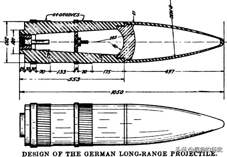 看起来很猛...然而依旧改变不了它是个战五渣的属性,主要问题出在炮弹上,巴黎大炮的炮弹重106公斤,然而战斗部只有7公斤的TNT装药,分量都在炮弹的厚钢壳上