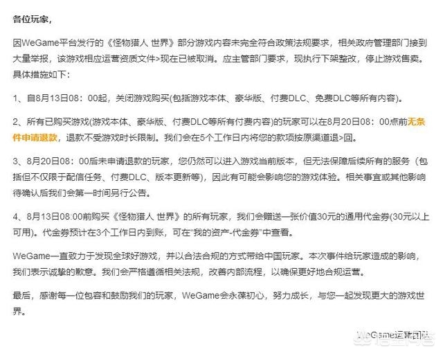 那么有意思的来了,这次WG赢了?嘿嘿,WG已经凉了,就在今天WG怪猎直接下架,为什么呢?因为被大量举报!WeGame平台发布公告,因部分内容未完全符合法律法规,相关政府管理部门接到大量举报,该游戏相应运营资质文件现在已被取消。