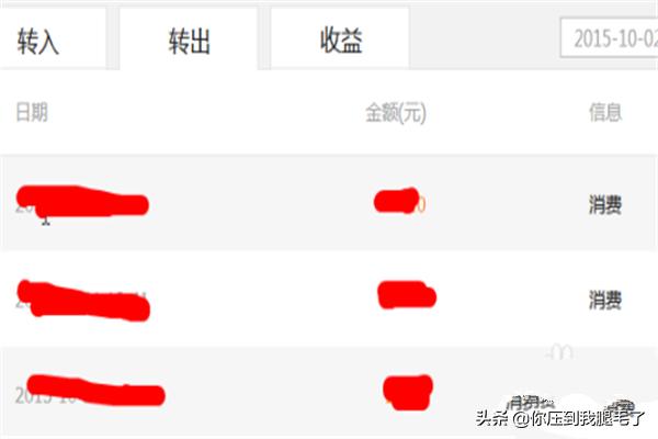 5点击转出,可以查看转出和消费的明细。一般转出是指转出到余额和转出到卡。消费则是指使用余额宝的资金直接付款的明细。