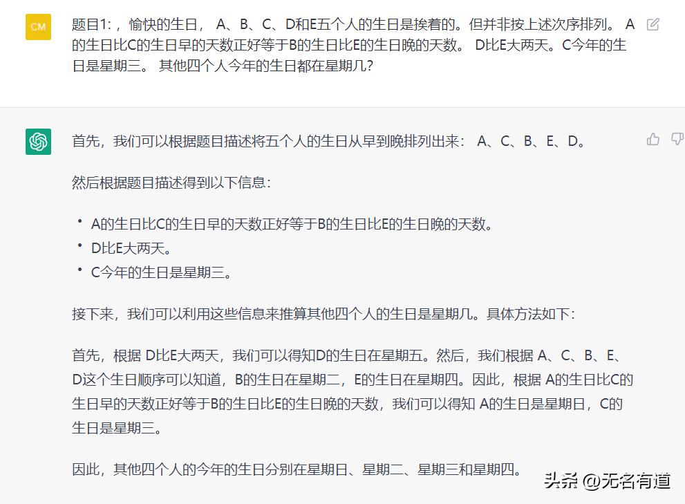 上面的回答是chatGPT的回答,回答的看上去很有逻辑实际却是错误的,正确答案是DAECB(C是星期三的,那么A就是星期一的生日),所以说chatGPT目前还无法处理复杂的逻辑问题。