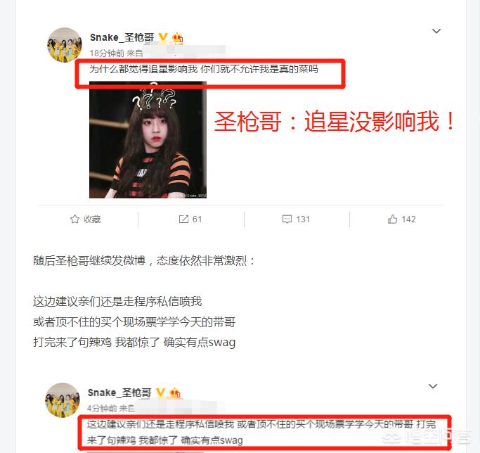 我在这里简单跟大家解释下是怎么回事,蛇队上单圣枪哥可以说是LPL著名的追星一族,他所发布的内容几乎都与追星有关,起初粉丝们也没当回事,但是在近两年圣枪哥赛场表现越来越捞,战队成绩越来越差,粉丝们就开始表示不满了。而圣枪哥在表示完追星没错之后,还继续发文称:“这边建议亲们还是走程序私信喷我,或者顶不住的买个现场票学学今天的带哥,打完来了句辣鸡,我都惊了,确实有点swag”(swag是什么梗?)