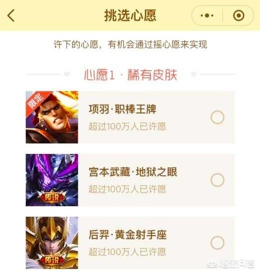 第二步:许下我们的王者心愿,心愿池共有三个永久皮肤和英雄供你选择。