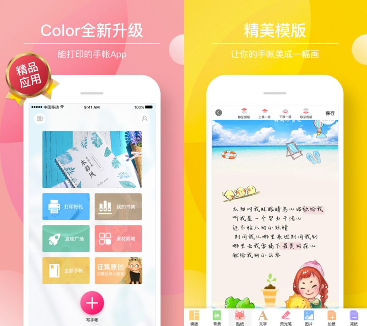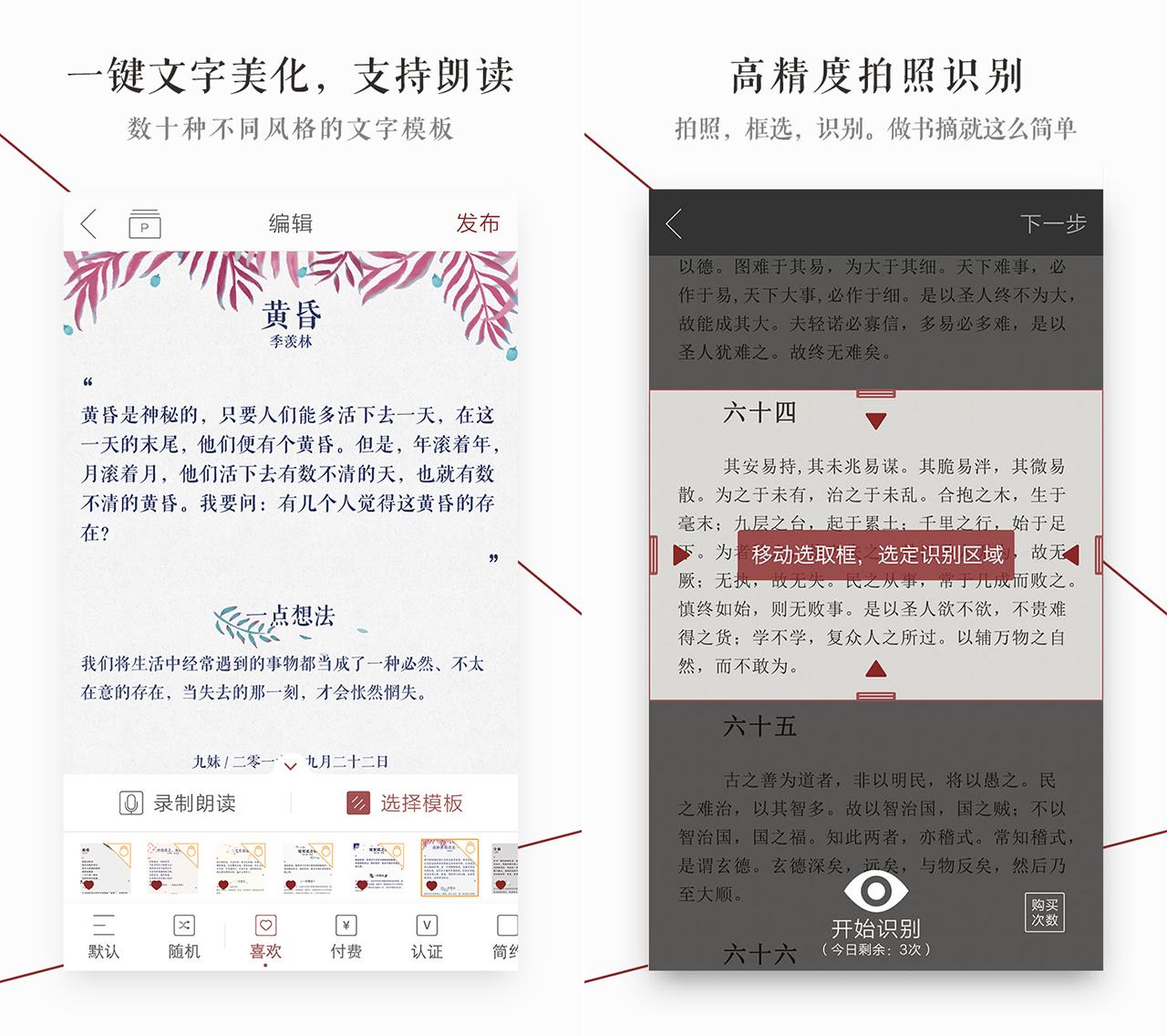 有很好看的模板,如果你只喜欢记录文字,可以用它,如果你还喜欢做些摘抄他也非常合适,可以用它的拍摄识别功能,把图片文字转换成电子文本。