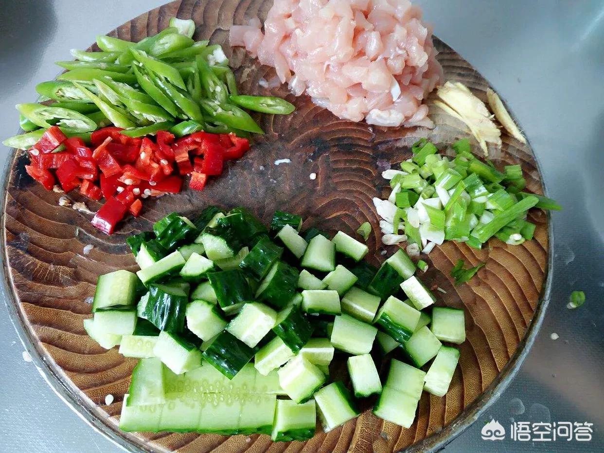2、黄瓜切丁,胡萝卜切丁,干辣椒切段,葱切小段,蒜切片,姜切片备用。