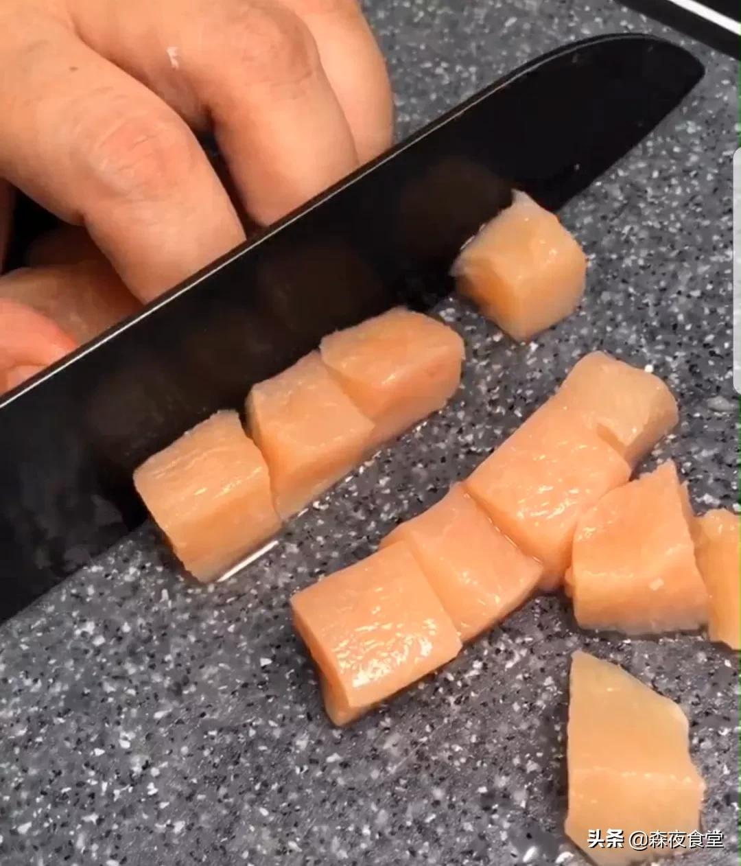 2,鸡胸肉丁内放一点盐、料酒、适量淀粉抓几下腌制半小时左右。