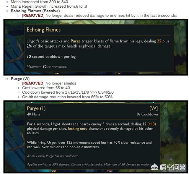 在最新的版本改动中,厄加特的W技能是迎来了重做,移除了护盾,减少了蓝量的消耗,同时他的CD从原本的高达17S的CD降低到了最少8S的CD时间,在到达满级之后,会变成0秒的CD时间,意思就是在满级的时候变成无限W,而且特效伤害是50%,相较于之前的33%的伤害是提高了一些,意味着他的伤害持续性变的更久了,目前的定位更加偏向输出类型,坦度是下降了。