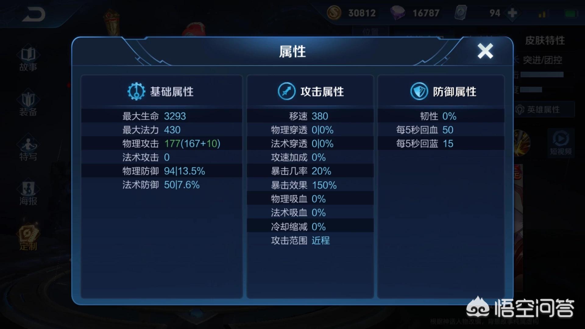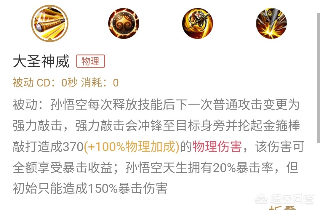 这里先讲解一下什么是暴击伤害,一般的英雄暴击伤害是200%,如果有300的物理攻击力,暴击伤害就是600,而孙悟空如果同样拥有300的物理攻击力,他的暴击伤害就是450,比其他英雄少了150,而悟空天生20%的暴击率和强力敲击则说明悟空靠暴击和普攻吃饭,所以我们要在悟空的暴击伤害上下文章,我们看他的强力敲击的这个被动,370(+100%物理攻击力),这个是享受全额加成的,我推荐的这套铭文,是加了9物理攻击力和36%的暴击伤害。