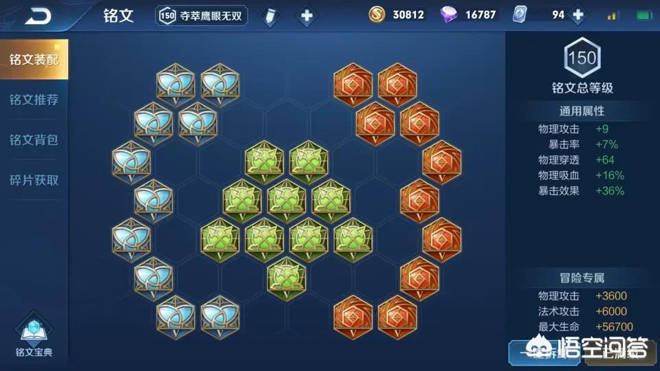 孙悟空这个英雄是非常吃铭文的一个刺客打野型英雄,这里首先推荐一套主流铭文,夺萃×10,鹰眼×10,无双×10,孙悟空的被动是出生就有20%的暴击率,但是暴击伤害只有150%。