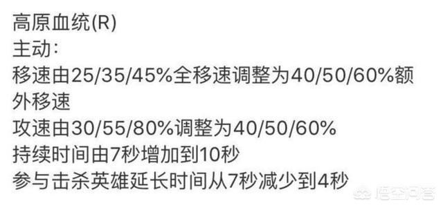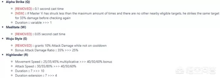 Q技能,移除0.1秒的施法时间,新增一个效果:当使用Q技能没有达到目标上限的时候,易会再次攻击目标,并造成33%的伤害。改动后不仅施放更加平滑,而且伤害不会溢出,个人觉得Q是史诗级的增强了一波。W技能移除0.05秒施法时间。E技能有所削弱,主动效果从35%减弱到25%。R技能,移速由25/35/45%全移速提升调整为40/50/60%额外移速,额外攻速加成从30/55/80%改为40/50/60%,持续时间从7S增加到10S,参与击杀英雄延长时间从7S减少到4S。