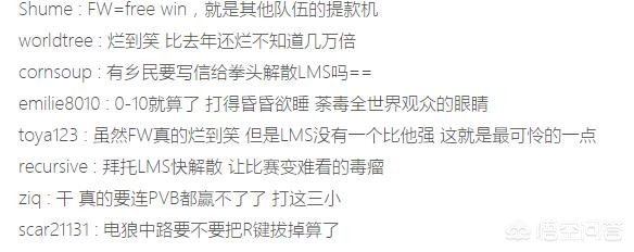 虽然对阵SKT输了并没有很奇怪,但是闪电狼的首日表现还是遭到了不少LMS赛区网友的怒喷。相较于去年小组赛非常无敌的FW,这届的FW显得弱了非常的多,LMS网友也是表示“比去年还烂不知道几万倍”“摆脱LMS快解散 让比赛变难看的毒瘤”