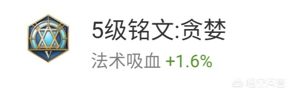 5级铭文:贪婪,属性是法术吸血+1.6%,10个就是16%了。再加上弑神之书25%的法术吸血,一共就能够达到41%。