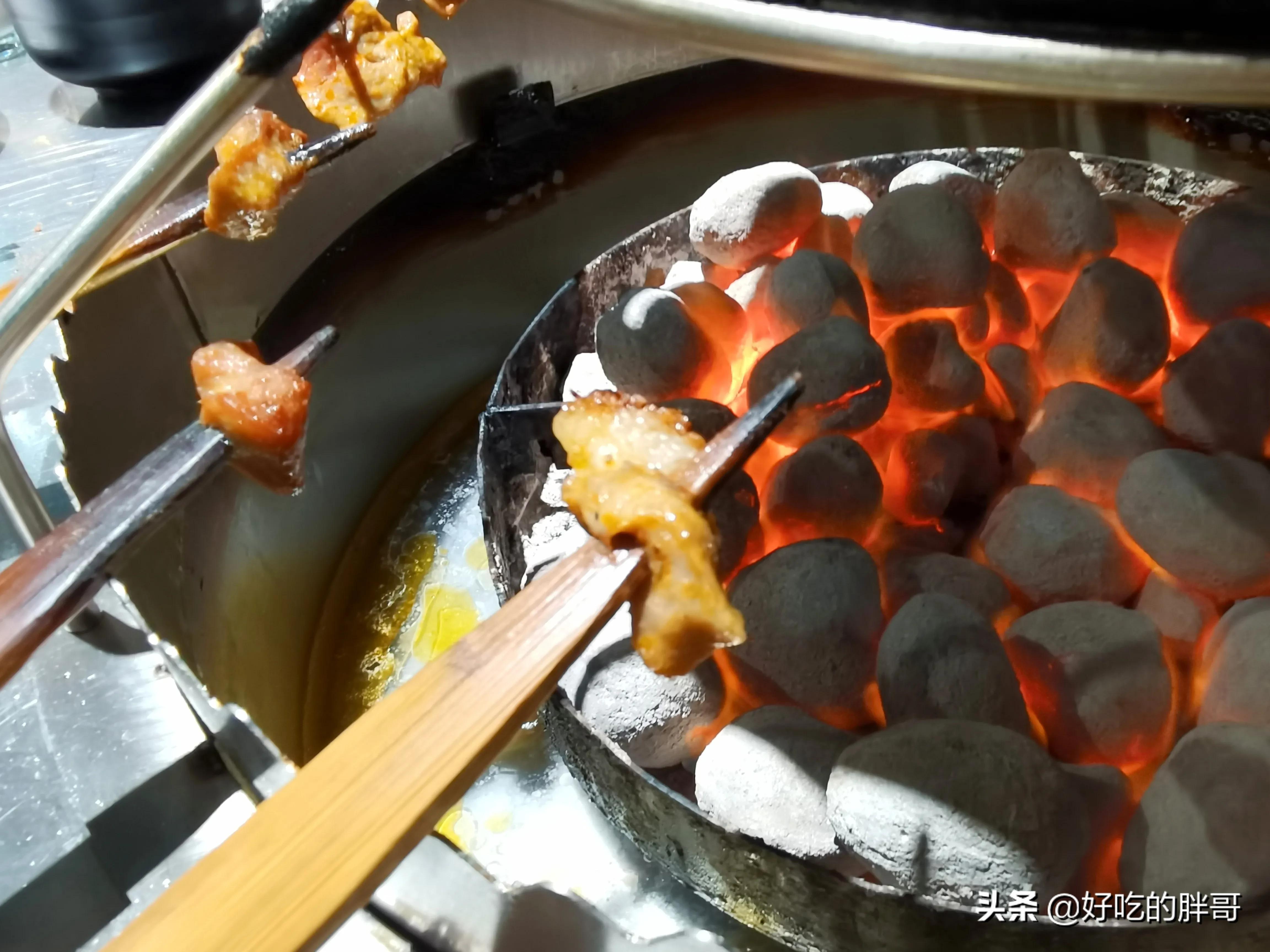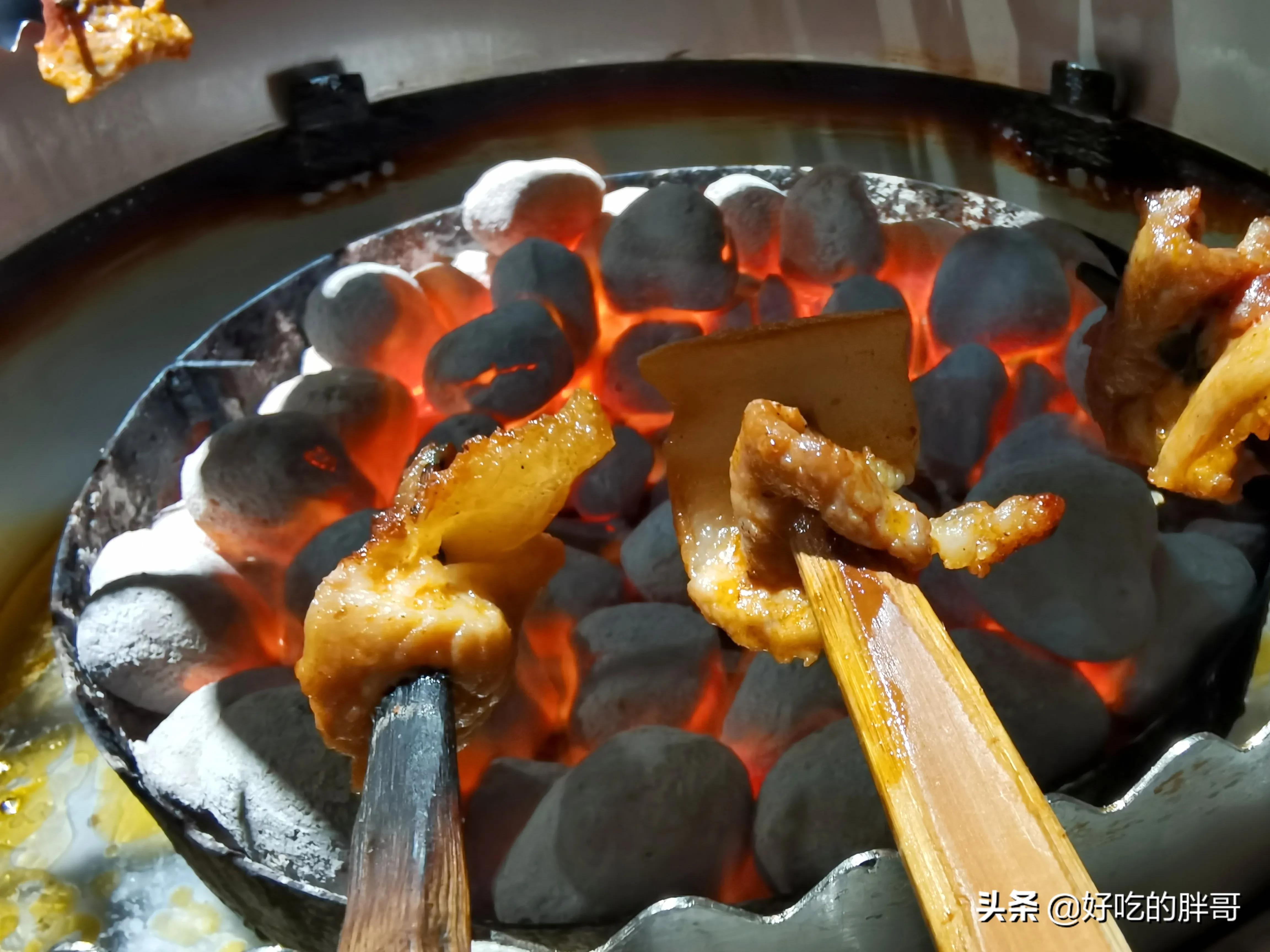 这种烧烤的用的肉非常的扎实,腌制的很到位,全部用大的竹签串起来围着火盆烤,中间还有一个铁板架,用于烤脑花与素菜用。