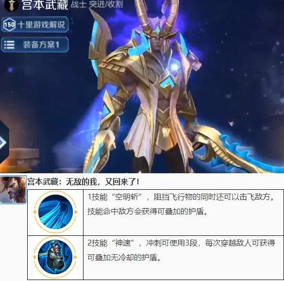 值得一提的是,喜欢宫本的网友可以开怀大笑了,无敌的那个男人又回来了,宫本一技能空明斩拥有击飞敌人以及命中敌人后获得可以叠加的护盾,宫本武藏的二技能“神速”又之前的一段位移改成了三段,并且可以叠加护盾,这么一来宫本及时不开大招,也非常强势,面对技能都增强的英雄,宫本的空明斩作用被无限放大,加上三段位移,团战中御敌保命两不误。