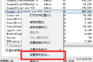 2然后我们切换到进程后,右击菜单栏,选择设置相关性。