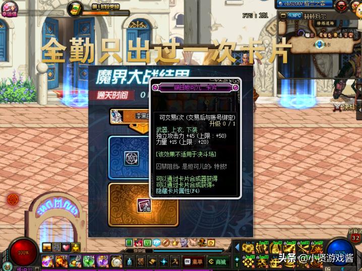 1.14日春节版本的开启,不仅有春节礼包的上架,还有魔界大战上线,在魔界大战中不仅可以获得改变技能形态和伤害的护石和符文,还可以获得不同品级的卡片,其中150四维的耳环卡片是这些卡片中最值钱的卡片。