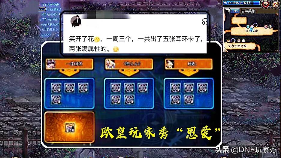 DNF魔界大战最幸运的玩家,一周出3张传说耳环卡,总共出了5张,耳环卡有这么好出吗?你怎么看