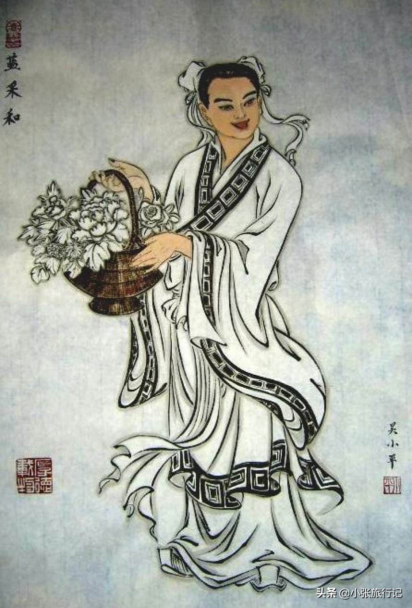蓝采和本为男子,却常常女装打扮,手提花篮,常穿破蓝衫,系着一条3寸多宽的木腰带,一脚穿靴子,一脚赤行,经常手持3尺多长的大拍唱板,在城市里边走边唱,行乞闹市中,乘醉而歌,周游天下,后来得到汉钟离度化,乘云而去。