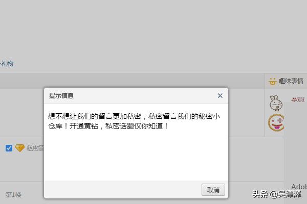 6、不过要注意的是,在勾选私密留言之后会弹出提示框,提示我们需要开通黄钻才可以操作私密留言哟。